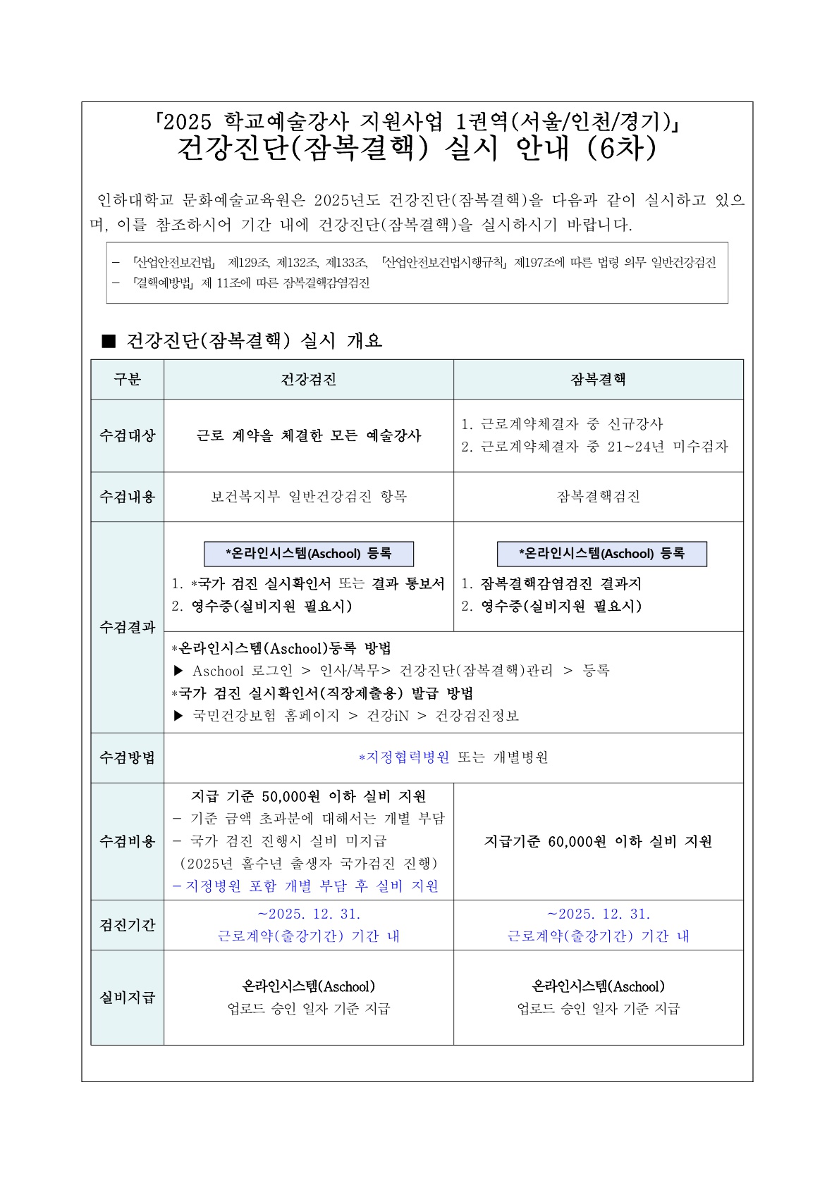 | 제목 | 2025 학교예술 강사지원사업 건강진단 및 잠복결핵 안내(6차) | ||