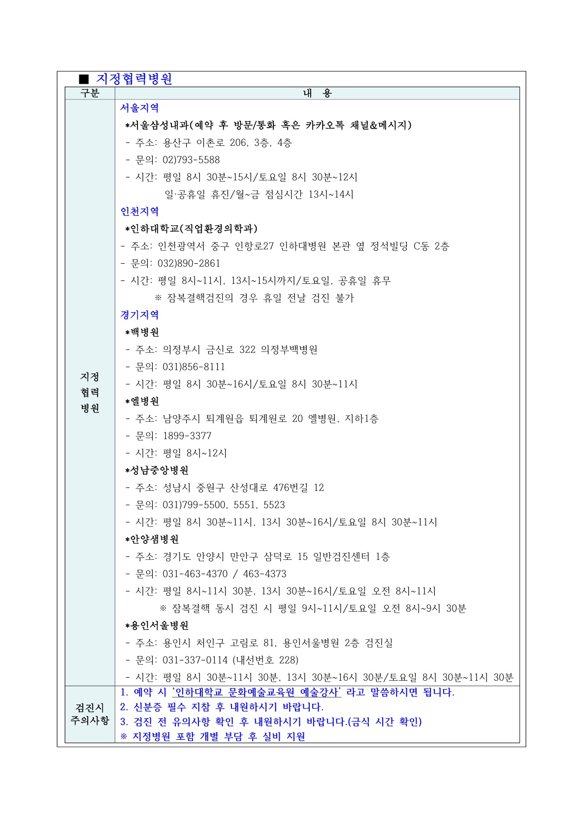 1. 안내문_서울삼성내과(서울).pdf 2. 안내문_인하대병원(인천).pdf 3. 안내문_백병원(경기).pdf 4. 안내문_엘병원(경기).pdf 5. 안내문_성남중앙병원(경기).pdf 6. 안내문_안양샘병원(경기).pdf 7. 안내문_용인서울병원(경기).pdf 건강진단 및 잠복결핵 안내(6차).pdf |