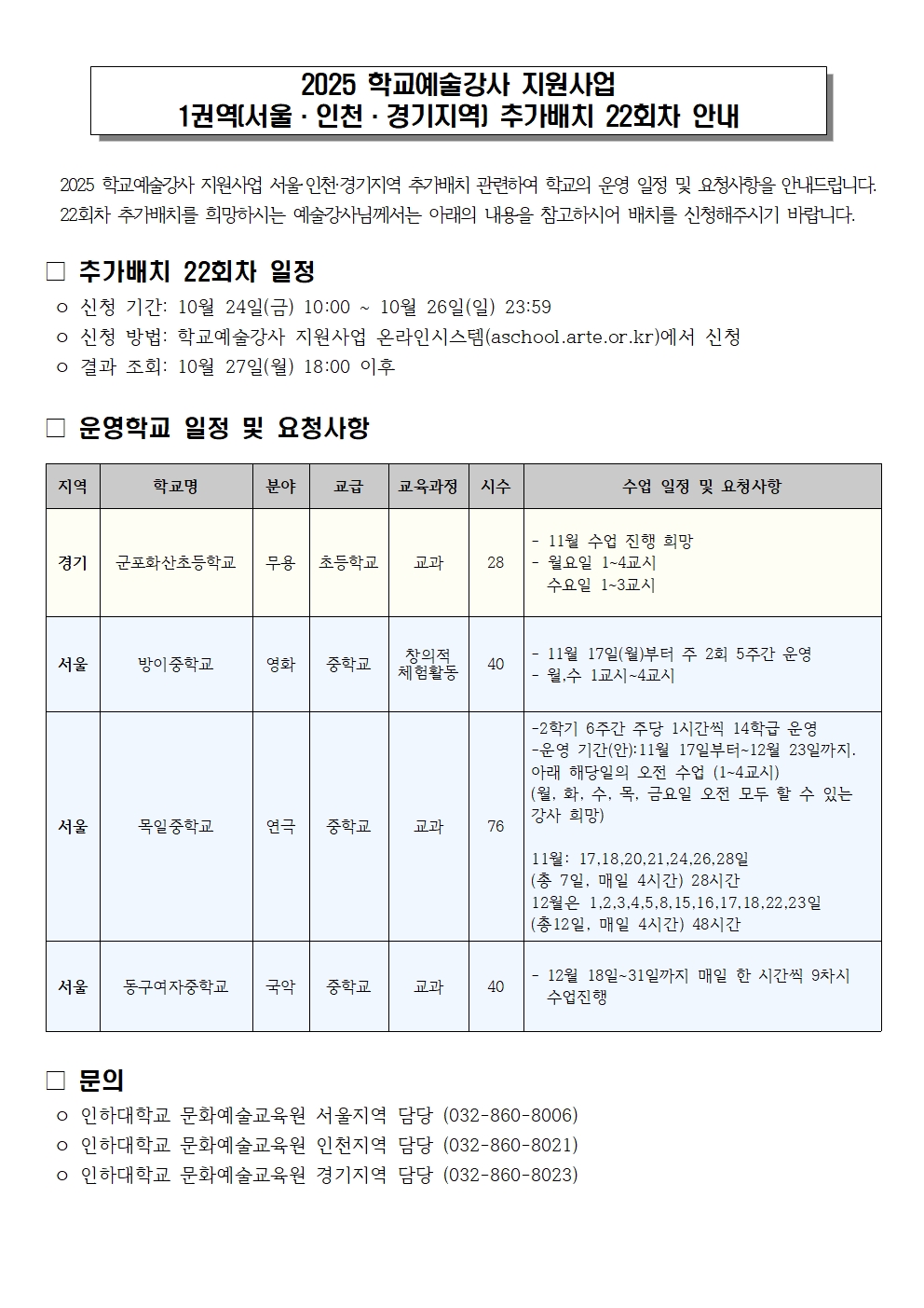 2025 학교예술강사 지원사업 - 추가배치 22회차 안내
